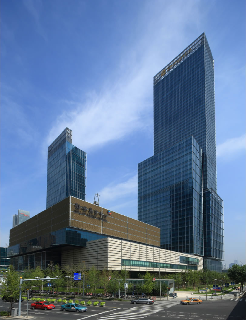 靜安嘉里中心地處繁華的南京西路商圈,嘉里中心聳立在上海市黃金地段,以優(yōu)越的位置和新穎的設(shè)計(jì)概念,迎合商界翹楚在商務(wù)和居住的要求。此項(xiàng)目結(jié)構(gòu)高度244.8米,鋼結(jié)構(gòu)用量約20,000噸,為帶伸臂桁架的(混合)框筒結(jié)構(gòu)體系。